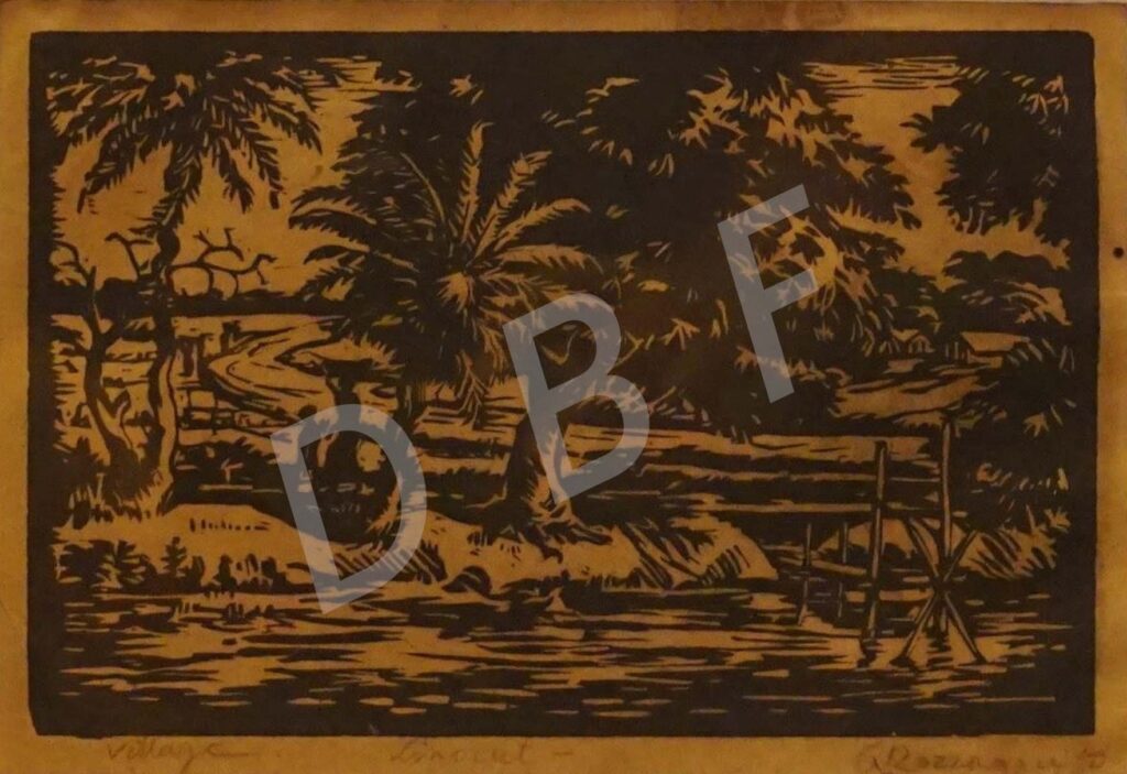 “Village” is a 1950 woodcut art by veteran artist Abdur Razzaque, a person, famous for his incomparable contribution to Bangladeshi art. He translates our village life in his wood-cut art piece with the utmost ease. His concisely composed village portrays the simplicity of our countrymen, the lives living there. He introduced the lush leafage, green pastures, quiet riverine, working shepherds, and balanced this ever-expansive world by bringing the dramatic movement of light and shadow. He captures our villages in their simplest yet most luxurious form.