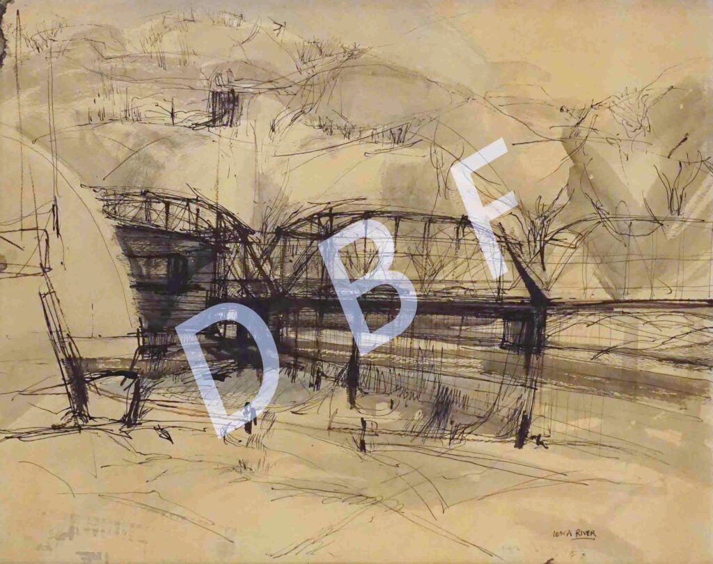 Abdur Razzaque, a legend in the art history of Bangladesh, painted “Bridge On Iowa River” while doing his masters in printmaking at the State University of Iowa. This captures his time and journey there. With minimal color and tools, he devoured the time in a piece of paper.