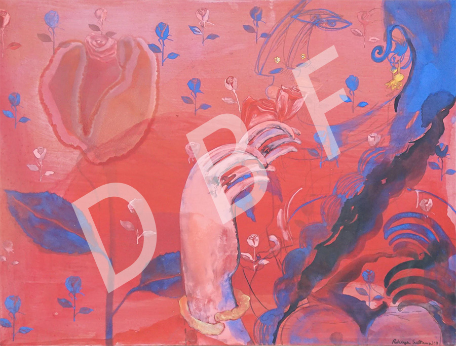 This painting a delicate and thoughtful study of internal battle. this celebrates the emotional journey of women. Painting in bright pink, she exploits the elements to declares the power of feminity. she takes us on an emotional journey of imagination and truth.